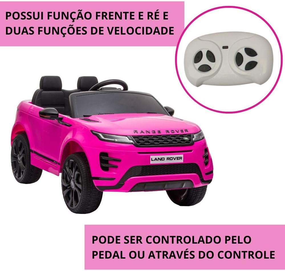 Mini Carro Elétrico Infantil Criança Land Rover Evoque 12V Com Controle Remoto Faróis de Led Som Usb Mp3 Carro BW128 - Importway: Acompanha controle remoto, bateria 12V e carregador Bivolt. O mini veículo pode ser controlado pela criança por meio de acionamento de pedal e controle da direção, ou por um adulto utilizando o controle remoto (alcance de até 20 metros). Também via controle remoto, o adulto pode acionar um botão de parada total segura, fazendo com que o brinquedo trave, proporcionando segurança. Ideal para crianças de 2 anos a 7 anos, com capacidade de até 25kg. Atinge velocidades até 5km/h. Possui marcha para frente, ré, neutro, 2 velocidades, faróis de led, som via bluetooth, rádio fm e buzina. Resistente e durável, peças de qualidade, para conforto e segurança dos pequenos pilotos.